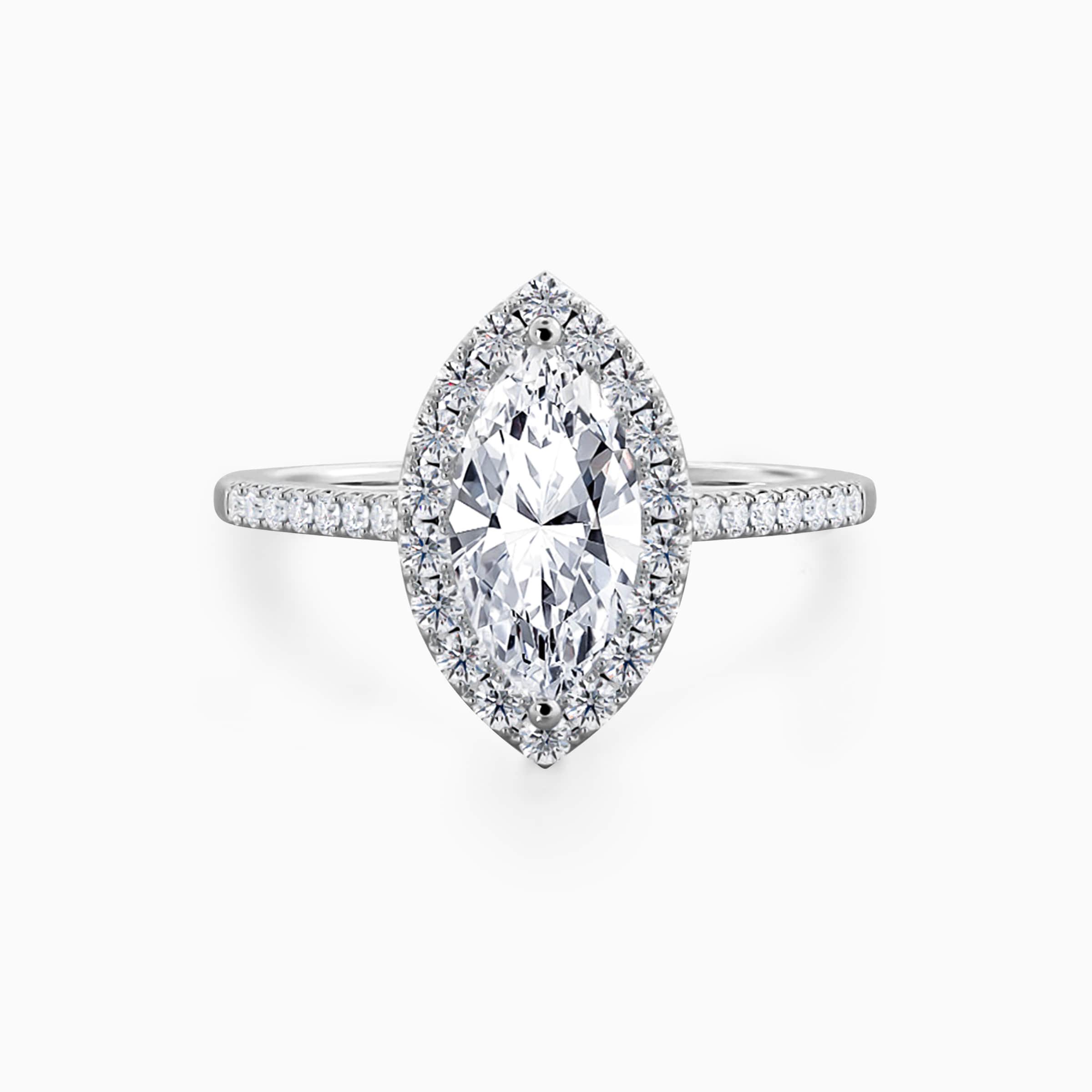 This breathtaking marquise halo engagement ring is the epitome of elegance and sophistication. The center stone, a stunning marquise-cut diamond, is surrounded by a halo of smaller diamonds, adding extra sparkle and shine. To further enhance the ring's beauty, the band is set with pave diamonds, which create a glittering trail of light that leads to the stunning center stone. It's a halo marquise diamond engagement ring that will be cherished for a lifetime and is sure to take your breath away every time you look at it.